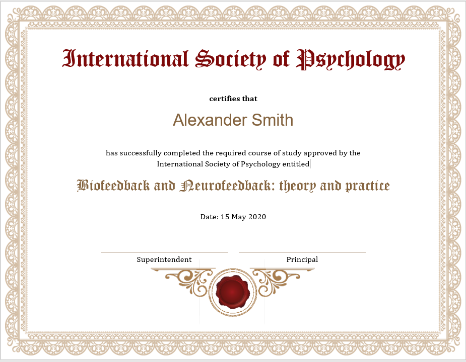 After passing the online verification test, the International Society of Psychology issues a regular completion course certificate like the following: